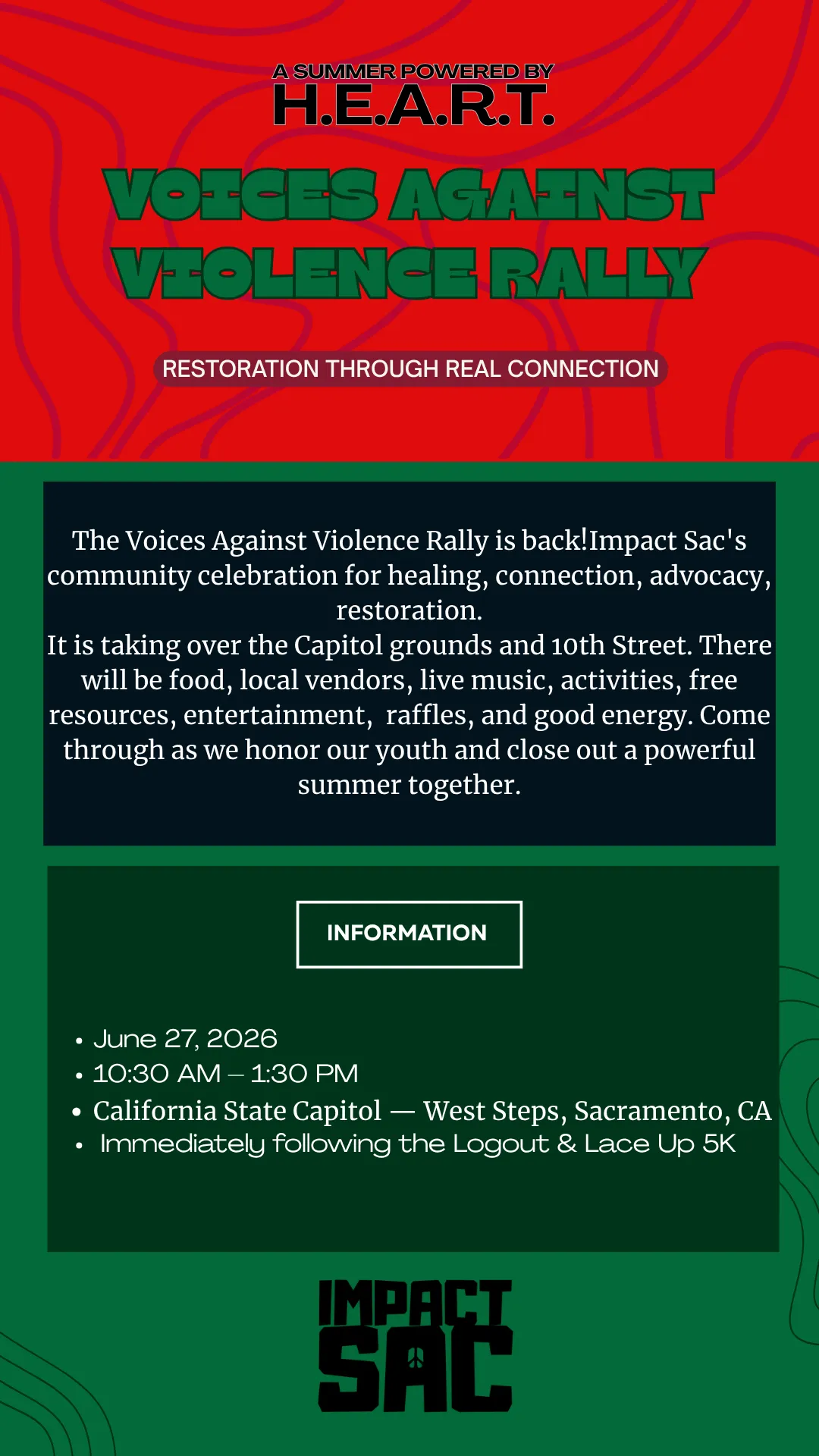 The Voices Against Violence Rally is back! A community celebration and violence prevention event at the heart of Sacramento. This is a safe space to honor the hard work of our youth, advocate for safer communities, and close out an impactful summer. This year we are expanding to both the California State Capitol grounds and 10th Street, bringing a full community experience designed to uplift, restore, and celebrate every person who shows up.